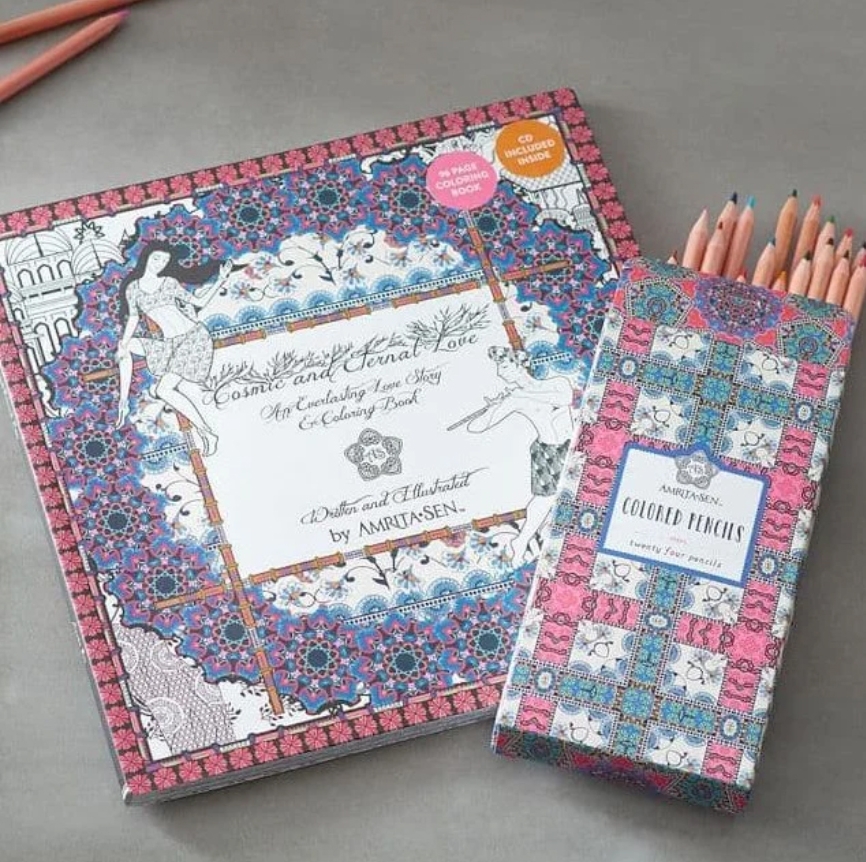 Cosmic and Eternal Love is the coloring book Amrita published to accompany the same story in ‘Hidden Women’. The book contains a musical CD that follows the narrative of the story of Radha and Krishna.
